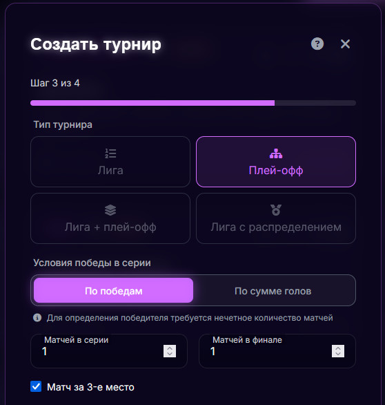 При создании турнира плей-офф (или при переходе из групп в плей-офф) теперь есть чек-бокс: «Проводить матч за 3-е место».
