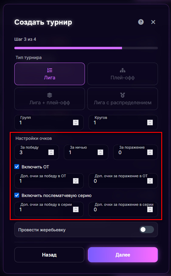 Теперь при создании турнира вы можете изменить базовые константы. Хотите давать 2 очка за победу? Легко. Хотите 0 за ничью? Пожалуйста. Это делает нашу универсальную платформу идеальной для специфических видов спорта.