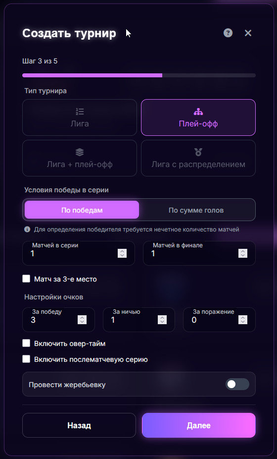 Минимум — четвертьфиналы, полуфиналы, финал. Плюс — матч за третье место, разные размеры сетки и возможность гибко настраивать структуру. Учитывать "не правильное" количество команд, например как составить сетку на 13 команд. Наш сервис Tournify умеет учитывать такие настройки турнира: как определяется победитель (по победам или по сумме голов), сколько матчей в серии, сколько матчей в финале.